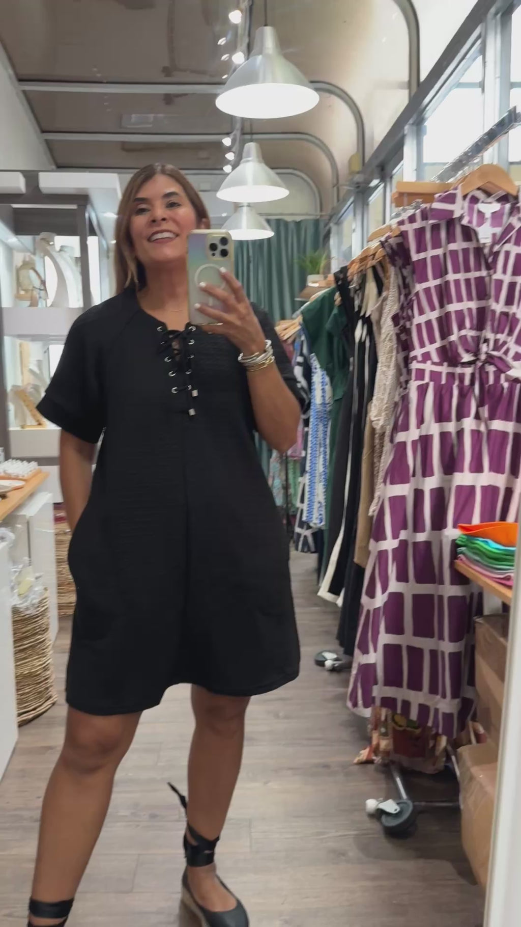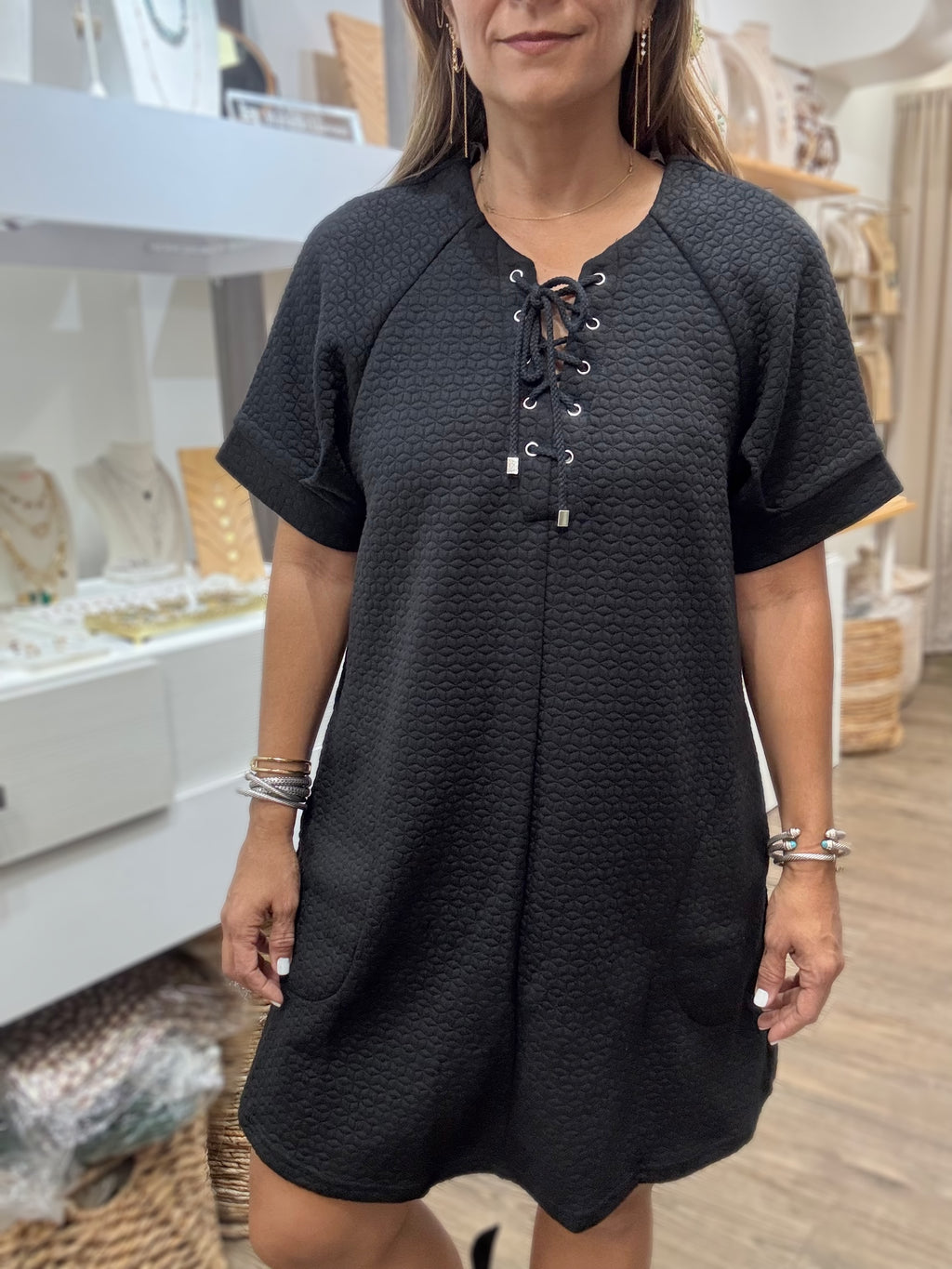 Black Textured Lace-Up Detail Dress