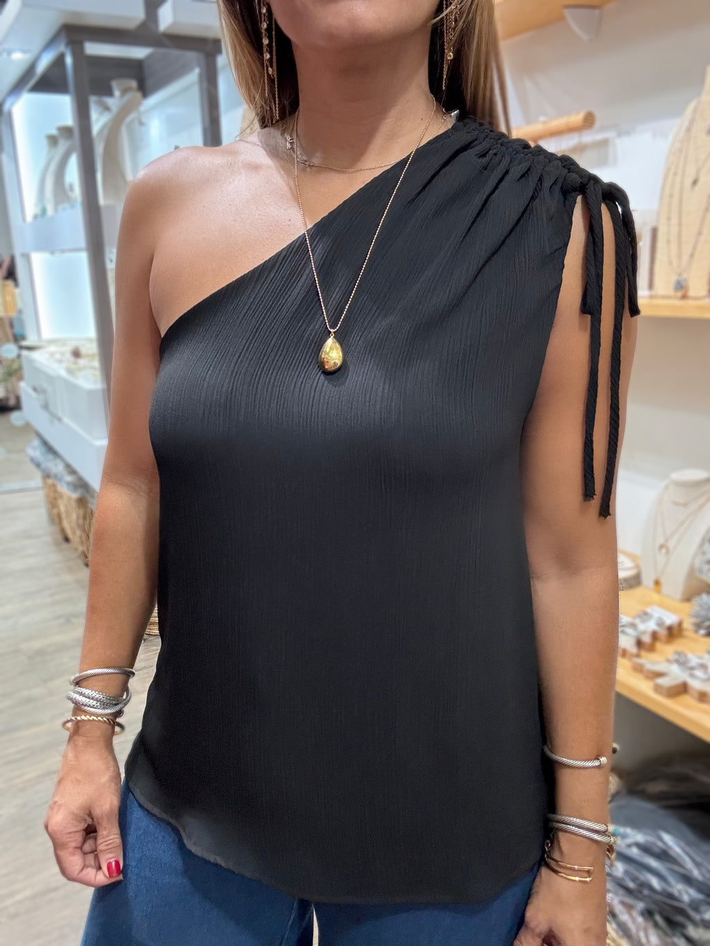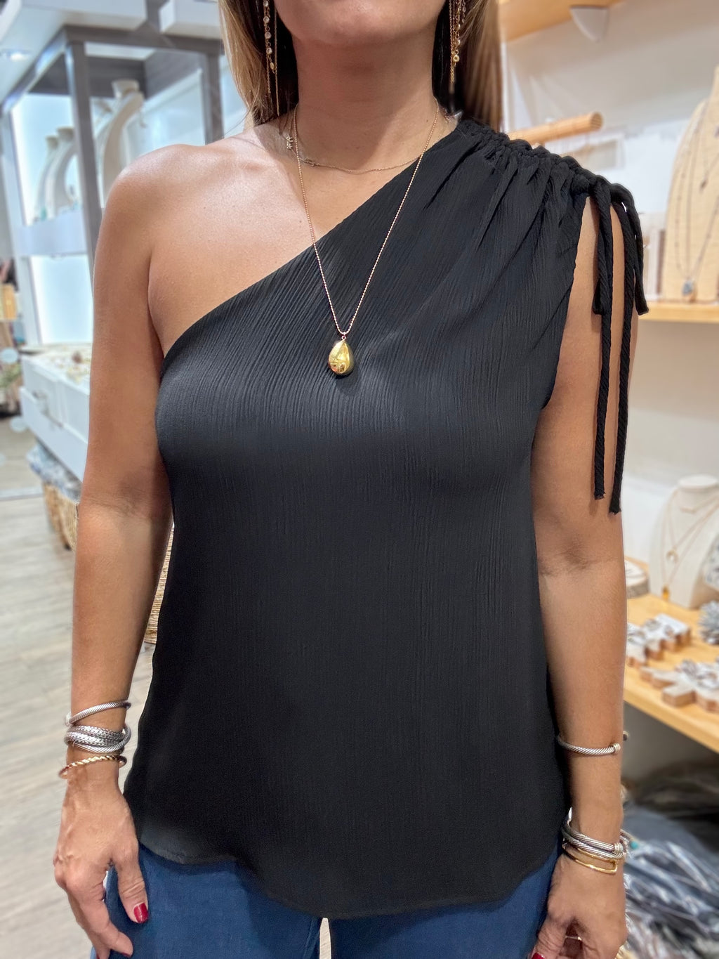 Black One Shoulder Drawstring Top