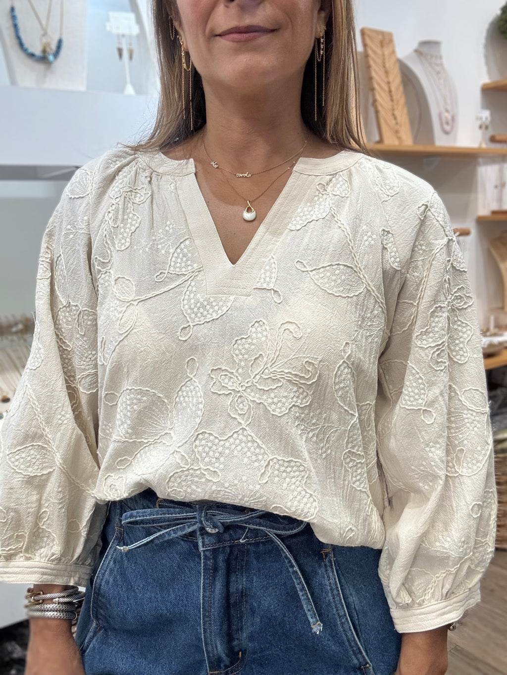 Almond Embroidered V-Neck Top