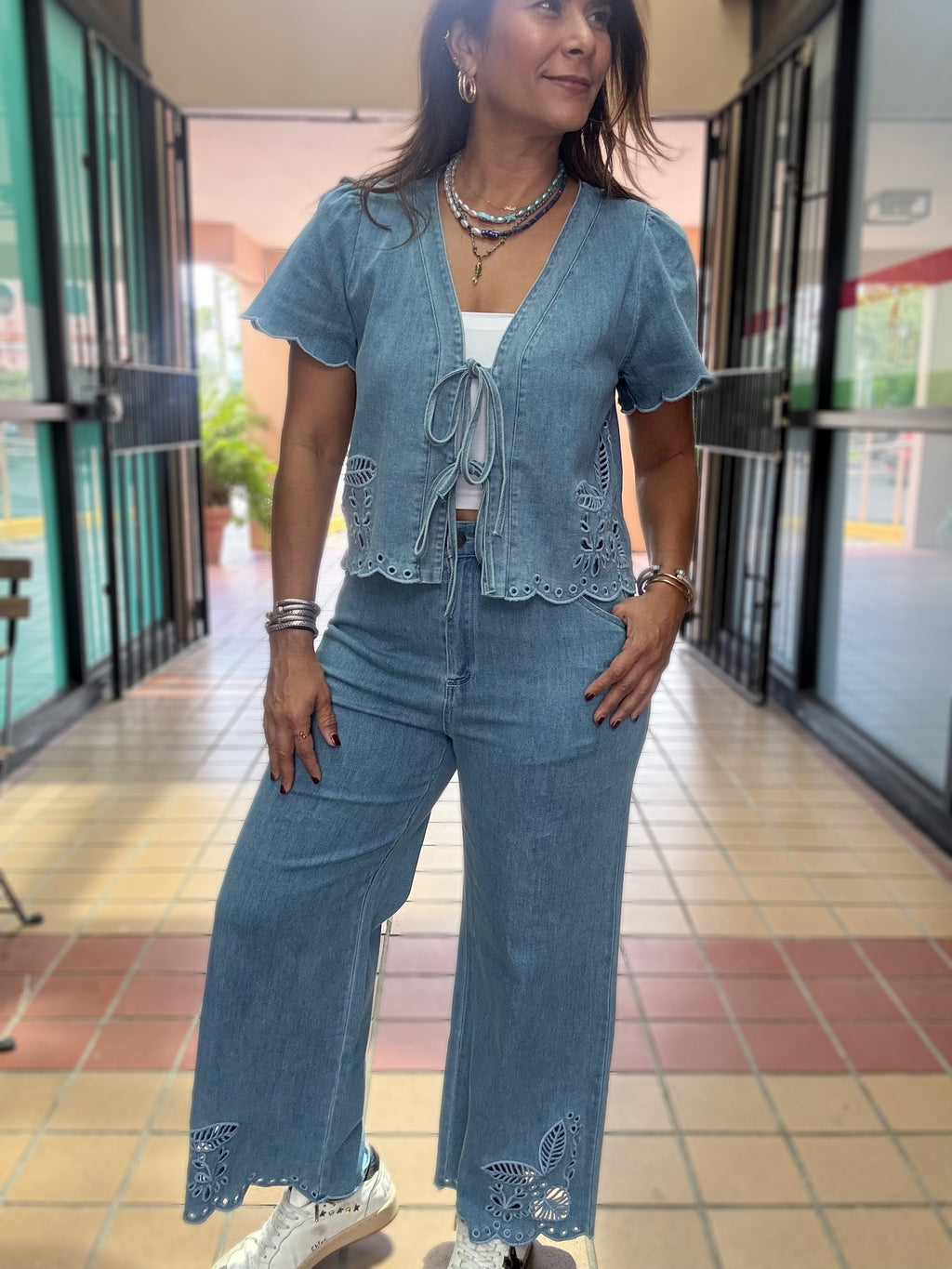 Light Denim Ties Front Top & Pant Set