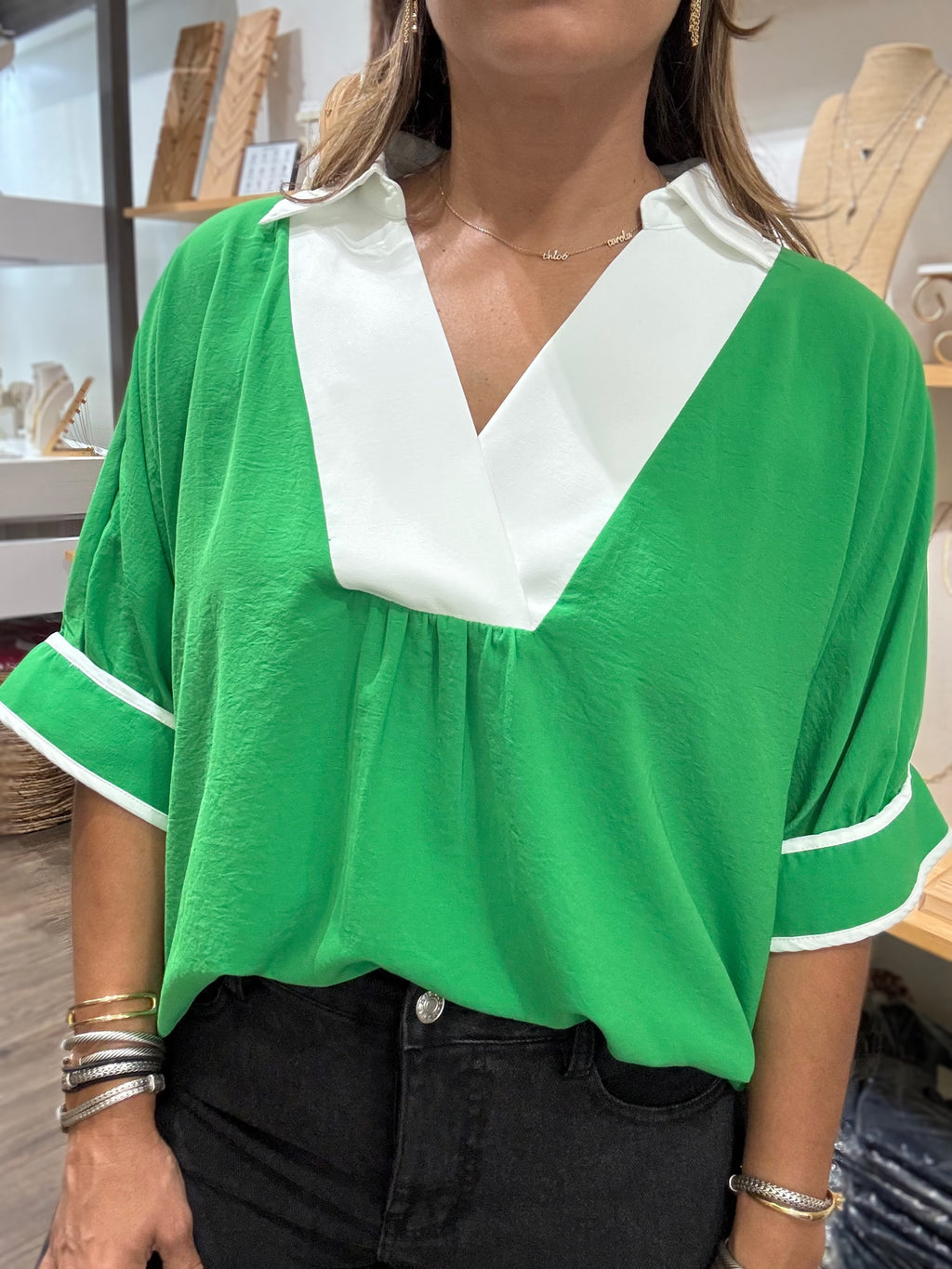 Green & White Collared Neck Top