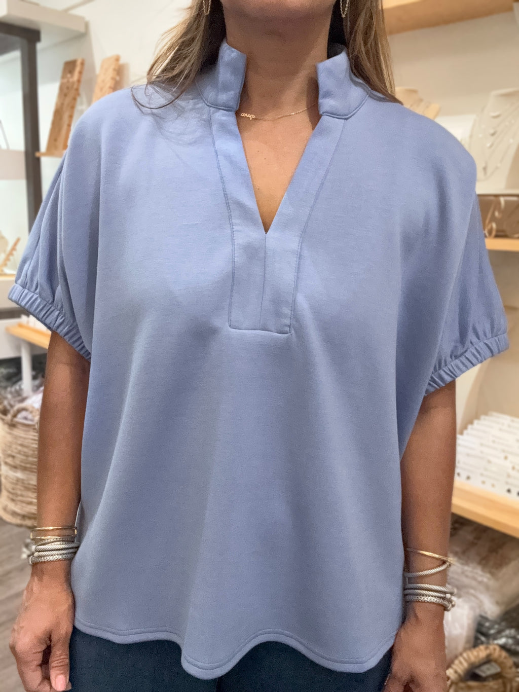 Blue V-Neck Dolman Sleeves Top